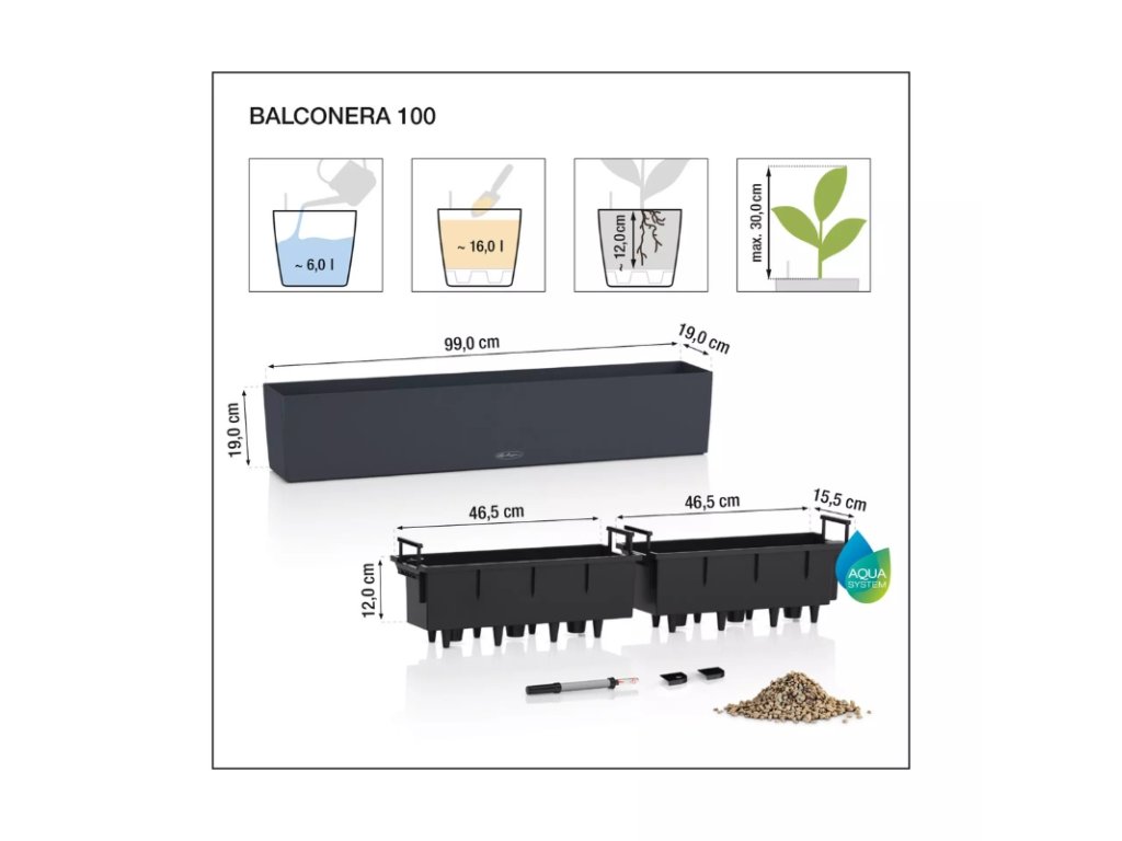 Truhlíky jsou dodávány s kompletním samozavlažovacím systémem, měrkou hladiny vody a drenážním substrátem.