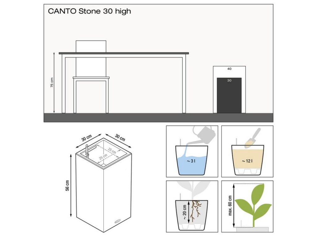 Samozavlažovací květináč LECHUZA Canto Stone je kombinací moderního designu a praktických funkcí, určený pro milovníky rostlin, kteří hledají esteticky příjemné a vysoce funkční řešení pro pěstování rostlin. Vyrobený z kvalitního plastu, který věrně imituje přírodní kámen, je tento květináč nejen elegantní, ale také velmi odolný vůči UV záření a mrazu, což ho činí vhodným pro použití jak v interiéru, tak i v exteriéru. Jedním z hlavních předností tohoto květináče je jeho inovativní samozavlažovací systém, který zajišťuje, že rostliny mají neustálý přístup k potřebné vodě, aniž by bylo nutné je často zalévat. Systém obsahuje indikátor hladiny vody, který usnadňuje sledování, kdy je třeba doplnit vodu.